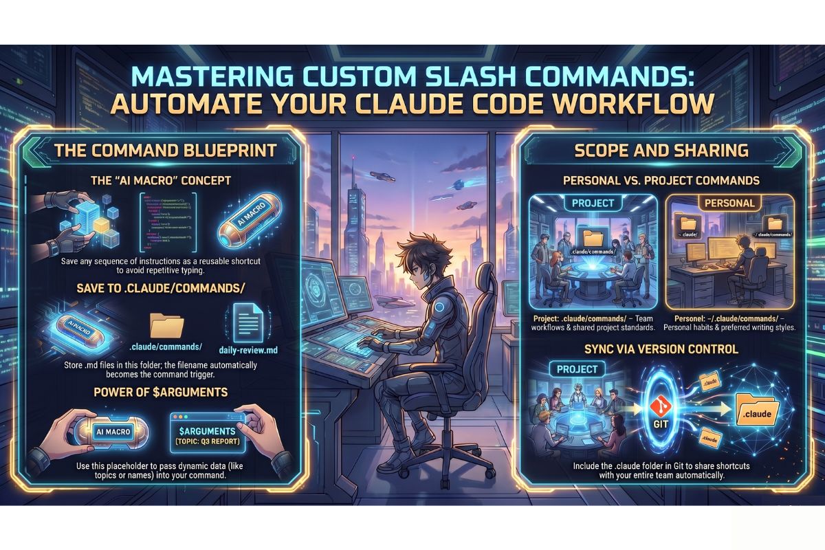Think of each custom slash command as a saved conversation starter: a ready-made, detailed prompt that you have pre-written and stored, so you never have to compose it from scratch again.