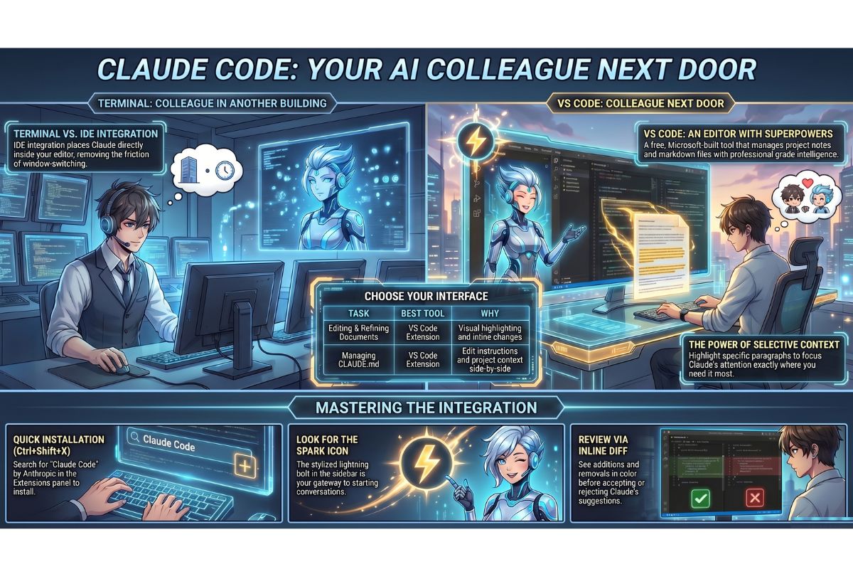 CLAUDE.mdfile, so all your project context and instructions are active from the start - VS Code with the extension is best when you are actively working on documents; the terminal is better for one-off commands, automation, and initial project setup