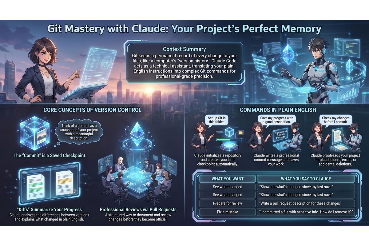 This lesson introduces Git — a system that keeps a permanent record of every change ever made to your files — and shows you how Claude Code can handle all the technical Git commands on your behalf. You will learn how to describe what you want in plain English and let Claude translate that into actions. By the end, you will be able to use Git confidently even if you have never opened a terminal before.